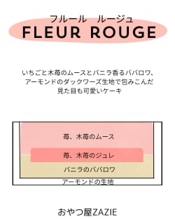 アーモンドをあわせたダックワーズ生地にバニラのババロワ、苺・木苺のジュレ、苺・木苺のムースを合わせたみんな大好きな組み合わせのケーキ。